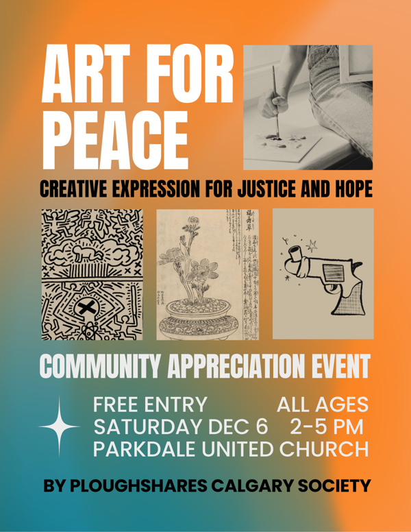 There will be a silent auction supporting Ploughshares Calgary Society including a donation from Pedro Reyes of Artist Against the Bomb, local visual art, a photoshoot package and more.