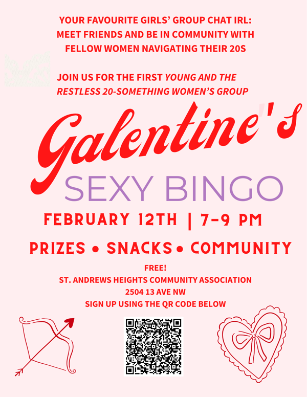 Galentine’s Day Feb 12 (see poster below for free registered event for women in their 20’s)