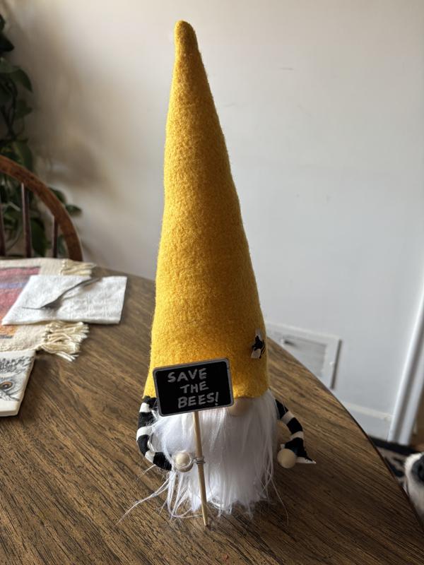 “A hand-sewn Save the Bees gnome was left at our front door this morning, and it truly touched our hearts. We are so grateful that someone took the time to make this for us. We plan to display it in our front garden as soon as we find a protective cover for it.